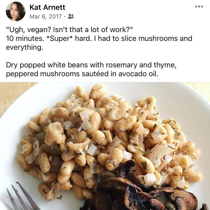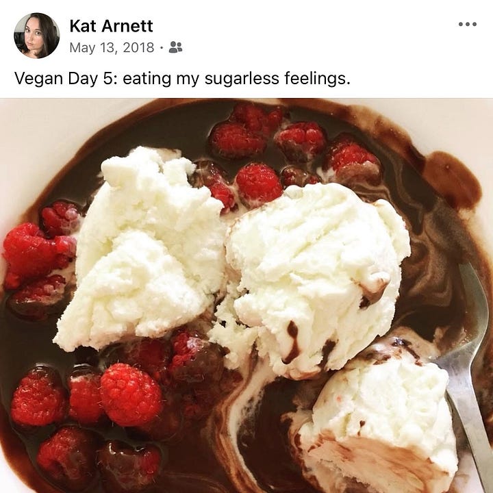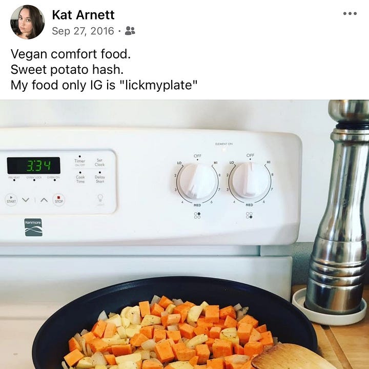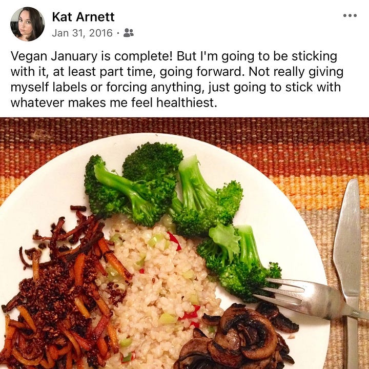 Every year after I committed to the first 31 days of the year going totally vegan. I found myself throughout the year going back to it whenever I felt bad. I hadn’t abandoned my restrictive eating plan entirely, I was still in the clutches of Goop-esque “clean food” culture, and I went about 15 years without eating a potato. But when I ate vegan food I felt better.